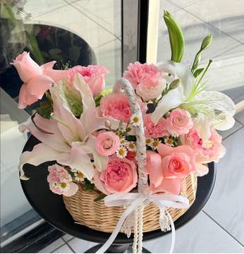 | 材料 | 9朵戴安娜粉玫瑰,3朵粉色康乃馨,2枝多头白百合,白色洋桔梗、洋甘菊、喷泉草、茉莉花等如图点缀 |