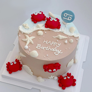 材料 鲜奶蛋糕,水果夹层,海星、贝壳装饰,可食用珍珠装饰,巨蟹座相关装饰品如图点缀(装饰品根据店里货源搭配,如遇货源紧缺,可更换相似搭配,造型整体不变)