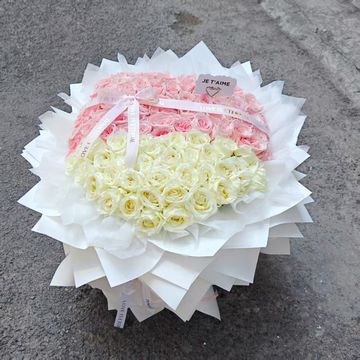 | 材料 | 99朵混搭,粉荔枝+白荔枝玫瑰如图做成心形玫瑰花束 |
