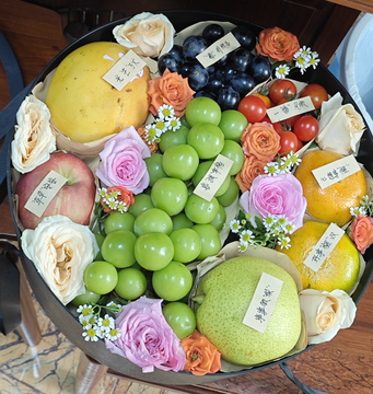材料 | 1份蓝莓,2粒橙子,1个梨,1份千禧果,1个芒果,1个苹果,1串阳光玫瑰,3支粉佳人玫瑰,4支香槟,3支辉煌玫瑰,搭配橙色多头泡泡、小雏菊丰满间插 |