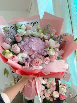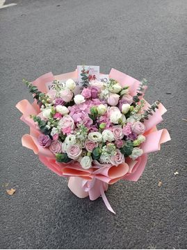 | 材料 | 1支淡粉色绣球花,14支精品粉玫瑰,5支海洋之歌玫瑰,3支多头粉康乃馨,4支白色 洋桔梗,搭配喷泉草、紫罗兰、尤加利叶丰满间插 |
