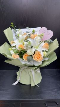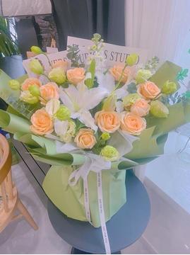 | 材料 | 11支香槟玫瑰,1支多头白色百合,搭配尤加利叶、白色紫罗兰、白色洋桔梗丰满间插 |
