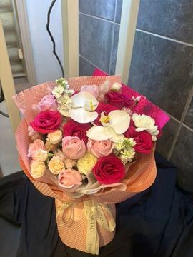 材料 | 8支弗洛伊德玫瑰,7支粉雪山玫瑰,2朵白色蝴蝶兰,搭配白色康乃馨,白色紫罗兰,粉色蓬莱松丰满间插 |
