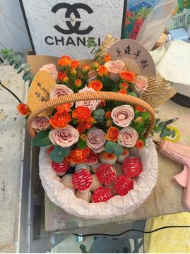 材料 | 18个鸡蛋,11支卡布奇诺玫瑰,搭配橙色泡泡玫瑰,尤加利叶,2把古风书法扇子丰满间插,鸡蛋表面装饰喜字 |