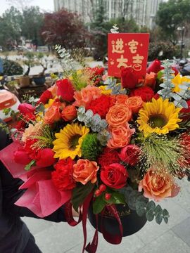 | 材料 | 6支向日葵,11支辉煌玫瑰,9支红玫瑰,11支红色康乃馨,搭配橙色多头泡泡,红豆,喷泉草,尤加利叶丰满间插 |
