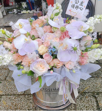 材料 | 11支粉玫瑰,5朵蝴蝶兰,1支六出粉百合,搭配和风泡泡,蓝星花,粉色蓬莱松,小粉康乃馨、翠珠丰满间插 |