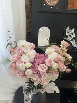 | 材料 | 15支粉色玫瑰,1支粉色绣球,6朵蝴蝶兰,搭配小雏菊、风铃花,喷泉草,小盼草,九星叶,白桔梗,粉色蓬莱松丰满间插 |