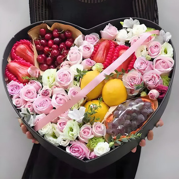 | 材料 | 23支粉玫瑰,搭配1串葡萄,4颗莲雾,250g车厘子,3颗柠檬,六出百合、绿桔梗、白桔梗,尤加利叶丰满间插 |