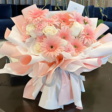 材料 | 8支粉色非洲菊,8支粉色康乃馨,5支白玫瑰,丰满间插 |