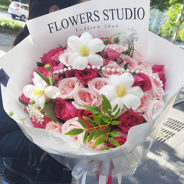 材料 | 11支弗洛伊德玫瑰,18支粉荔枝玫瑰,3支白色郁金香,搭配苏菲宝贝多头泡泡,白色和紫色翠珠,九星叶丰满间插,表面一串珍珠装饰 |