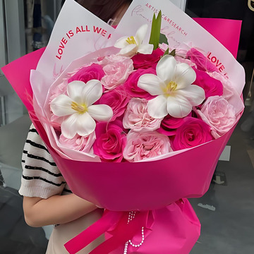 包装 | 内衬白色欧雅纸,英文纸装饰,外围玫红色欧雅纸,蝴蝶结束扎,珍珠链装饰 |