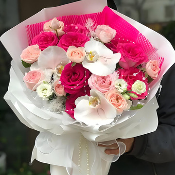 材料 | 8支弗洛伊德玫瑰,3朵白色蝴蝶兰,1支粉玫瑰,搭配仙子之吻多头玫瑰,白桔梗,白色蓬莱松丰满间插,表面珠链装饰 |