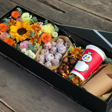 | 材料 | 1支向日葵,3支粉雪山玫瑰,暖冬四件套:1杯蜜雪冰城奶茶,250g山楂球,250g糖炒栗子,1个烤红薯,1支绿色康乃馨,搭配尤加利叶、白色小菊、吉星小菊、白色小雏菊、白桔梗、橙色多头泡泡丰满间插,表面一串灯串装饰 |