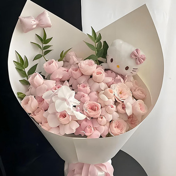 | 材料 | 19支仙子之吻多头玫瑰(掰开造型),3朵白色蝴蝶兰,搭配九星叶丰满间插,1个KT猫玩偶装饰 |