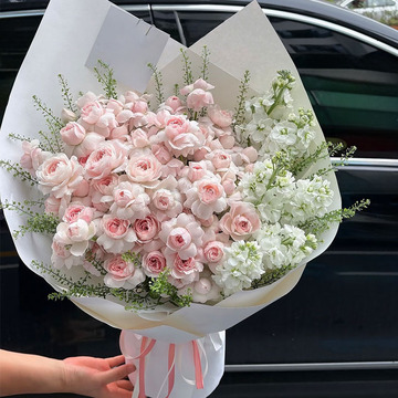 | 材料 | 33支仙子之吻多头玫瑰(掰开造型),搭配6支白色紫罗兰,外围绿铃草丰满间插 |
