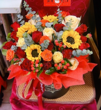 | 材料 | 4支向日葵,16支红玫瑰,6支香槟玫瑰,搭配橙色多头泡泡,红豆,尤加利叶丰满间插 |