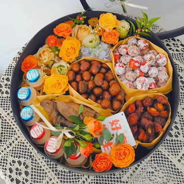 2枝黄玫瑰,2枝香槟玫瑰,橙色多头玫瑰,绿色桔梗,绣球,小菊,6瓶养乐多,糖炒山楂,炒板栗,半边梅,2根烤红薯。(零食包装袋颜色图片为主,所有零食均在超市购买,根据所在超市货源可替换同价位)