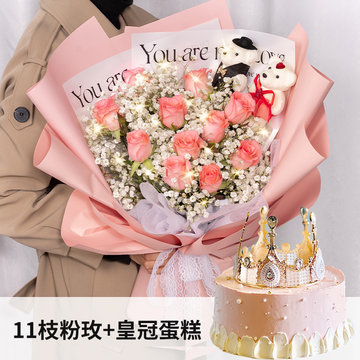 11枝戴安娜粉玫瑰 白色满天星 1灯串 1对小熊+圆形鲜奶蛋糕