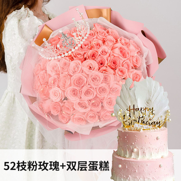 52枝戴安娜玫瑰,搭配1顶皇冠+1条彩灯+双层圆形鲜奶蛋糕,水果夹层,食用珍珠装饰,羽毛装饰