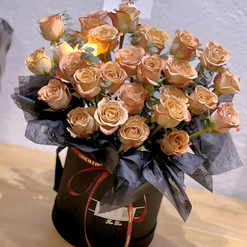 33支卡布奇诺玫瑰,搭配尤加利叶丰满间插,一颗小灯泡(如没有就换成灯串)