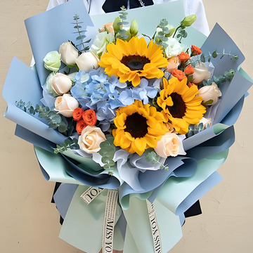 3支向日葵,11支香槟玫瑰,1支蓝色绣球,搭配橙色多头泡泡,白桔梗,尤加利叶丰满间插